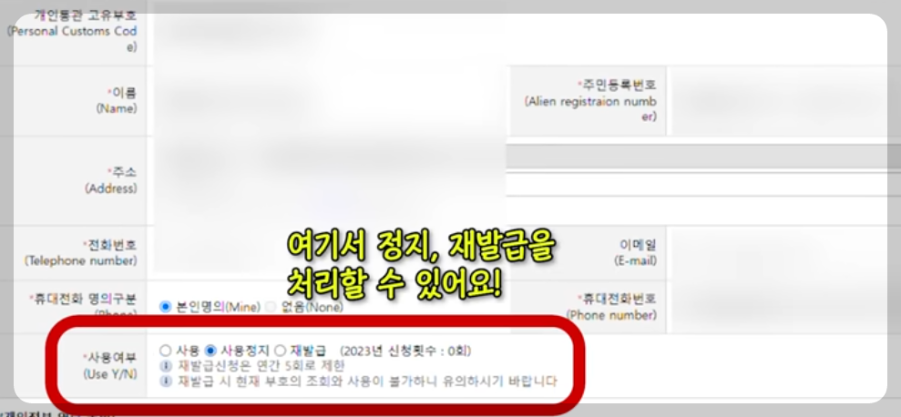 ⑤ 아래 화면에서는 개인통관고유부호를 정지, 재발급을 처리한다.