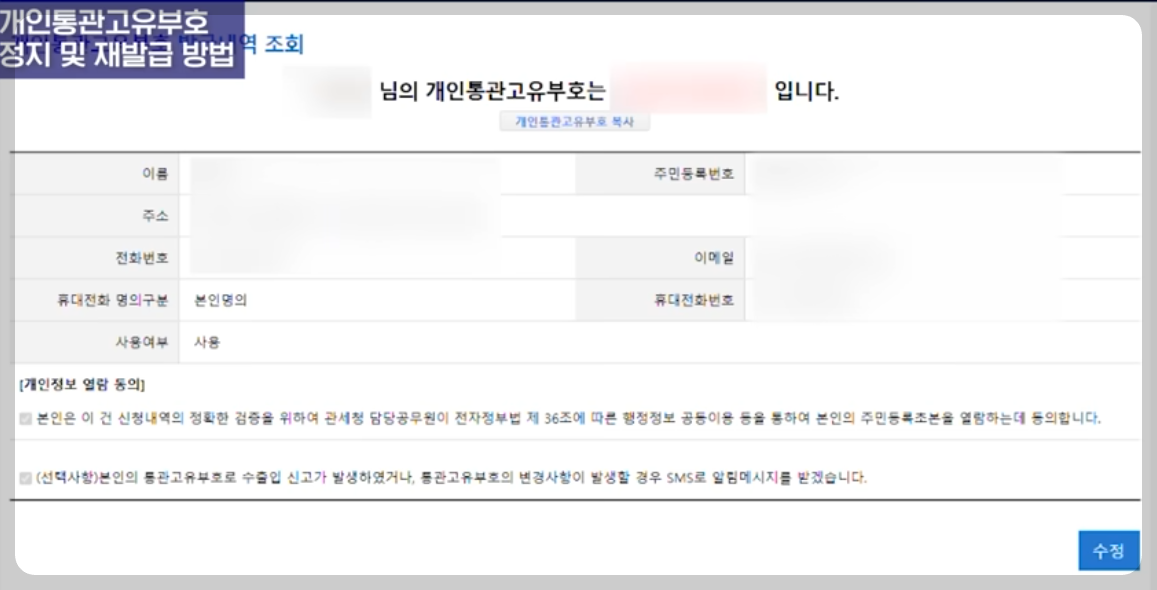3) 연락처가 바뀌었다면, 반드시 변경된 연락처와 개인통관고유부호현행화한다.