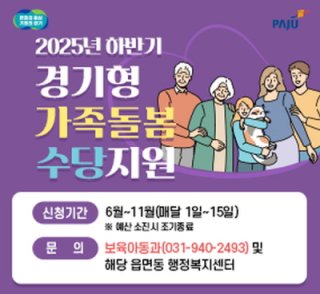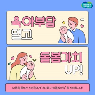 | 경기도 상반기 기준: 생후 24~48개월 미만 아동 (2025년부터소득 무관) | 맞벌이, 한부모, 다자녀 등 양육 공백이 발생한 가정 | 4촌 이내 친인척 (조부모, 이모, 삼촌 등) — 친인척형 |