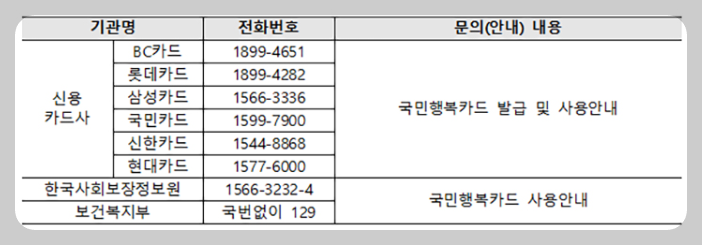 국민행복카드와 관련한 자세한 사항은 국민행복카드 누리집(voucher.go.kr) 또는 각 카드사 고객센터를 통