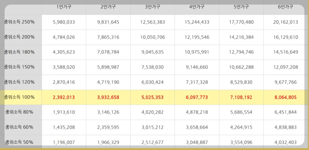 기준중위소득은 모든 가구를 소득 순서대로 정렬하였을 때 중간에 있는 가구를 말합니다. 기준중위소득이
