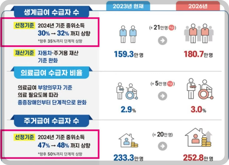 ㅡ 생계급여: 기준 중위 소득 32% 이하