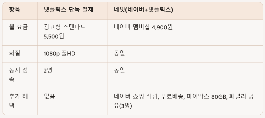와 실용성을 모두 잡은 선택이라 할 수 있습니다. 넷 플릭스와 네이버 플러스 멤버십이 결합된 네넷 서비스