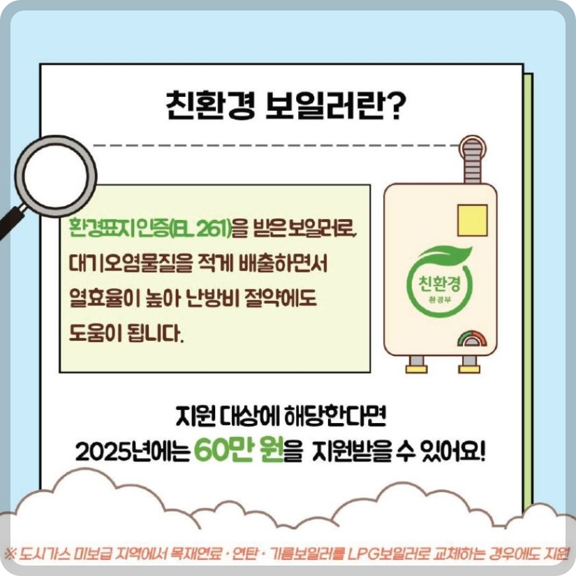 보일러교체지원금은 가정용으로 친환경 보일러 노후교체 시 정부에서 60만 원 지원합니다. 노후된 보일러