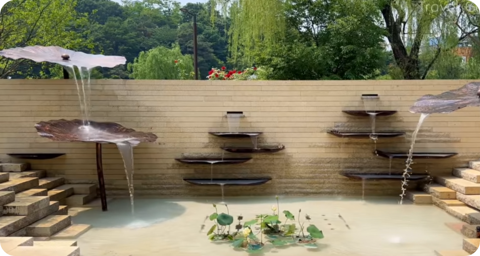 ⦁ 미리내 정원은 공간으로 활용하여 연임모양의 조형물과 연꽃이 조하를 이루었어요. 시원하게 쏟아지는 물