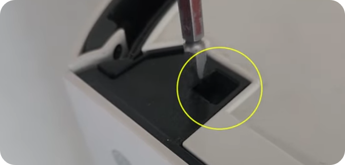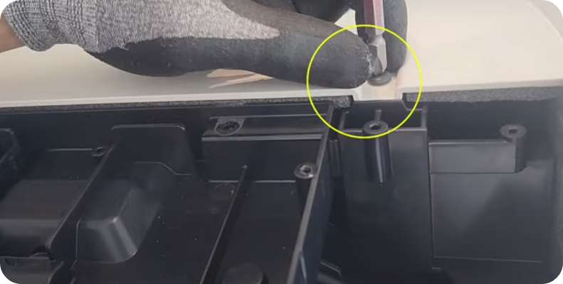 6) 양쪽날개 중 좌측에 피스 4개를 빼고 위화면과 같이 위에서 피스를 뽑고 덮게를 분리하고 떼어냅니다.