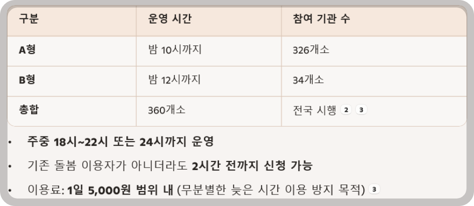 ● 특히 자정까지 운영되는 B형 센터는 야간 근무가 잦은 부모에게 큰 도움이 됩니다.