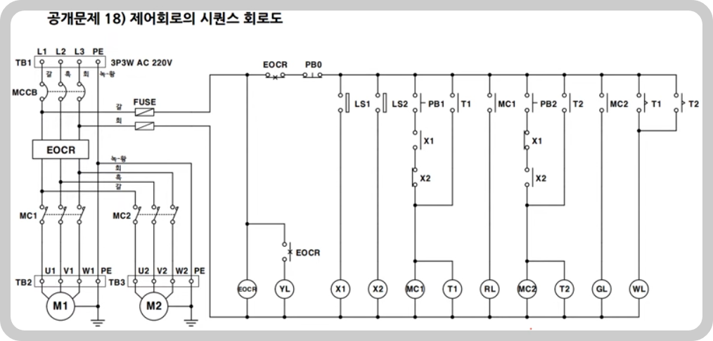 ㅡ 왼쪽 TB1에서 전원을 공급받아서 차단기를 거치고 EOCR을 서셔서 MC를 거치고 M1과 M2에 이르는