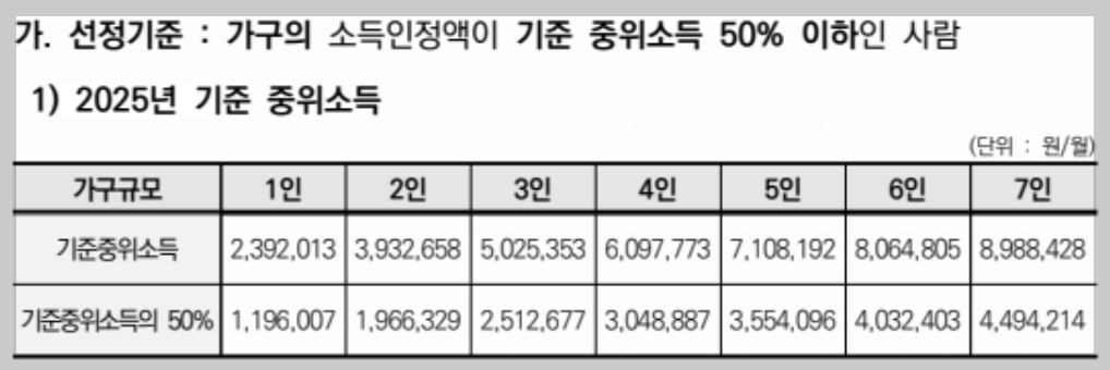 ㅡ 기초생활 수급자는 가구의 소득인정액이 선정기준 이하 일 때 지원 가능합니다.