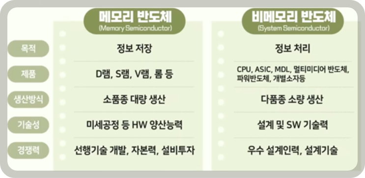 ⯄ 반도체산업은 용도에 따라 메모리반도체와 비메모리반도체로 구분된다.