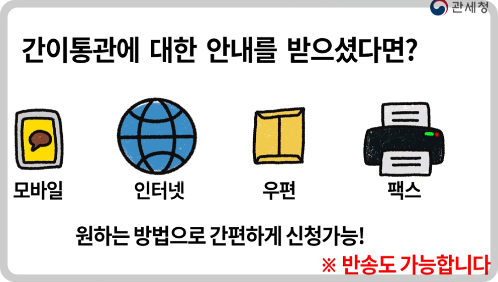 ⯄ 간이통관은 직접 모바일, 인터넷, 우편, 팩스, 현장방문 등의 방법으로 간편하게 할 수 있습니다.