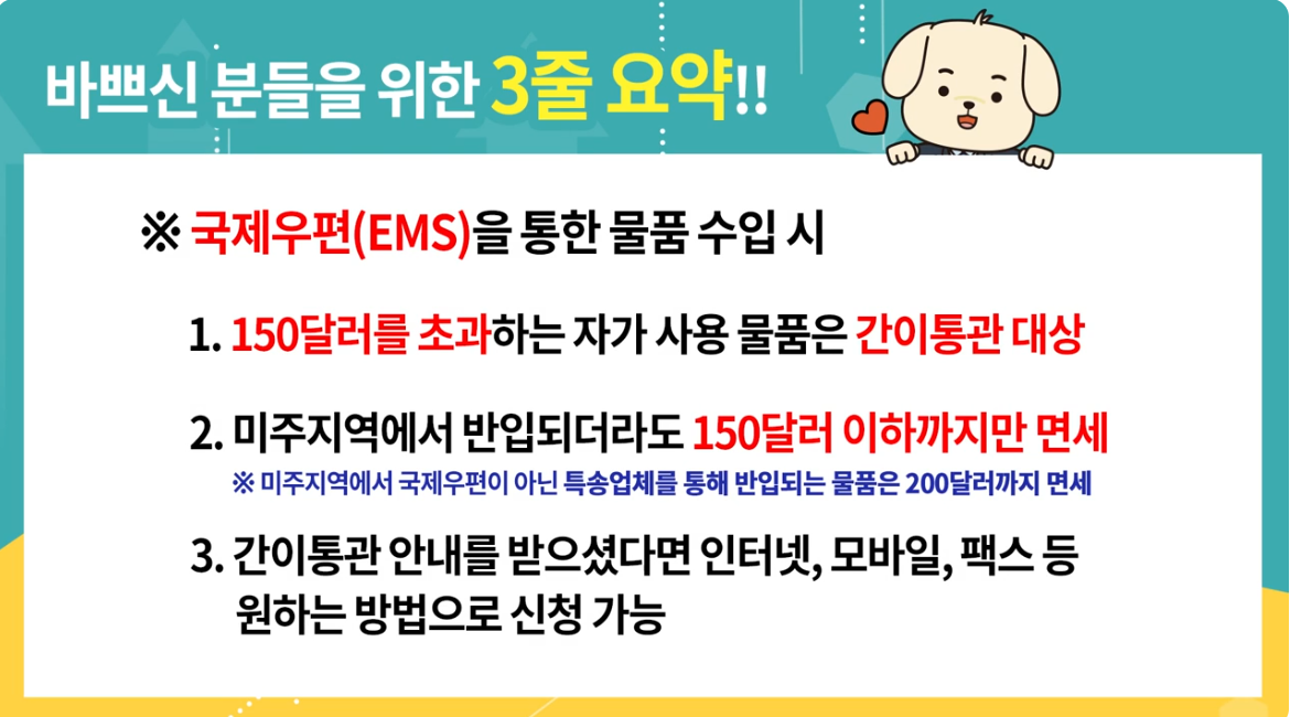 ※ 품목들은 금액과 관계없이 정식 수입신고를 해야 하며, 이 경우 미국 물품도 150달러까지만 면세됩니다.