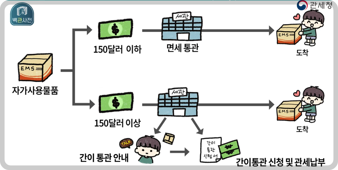 ⯄ 150달러 이하는 면세범위이고 150달러 이상은 간이통관 절차를 해야 합니다.